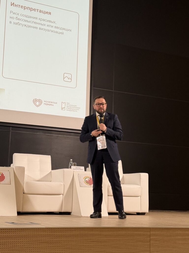 Спикер раскрыл основные инструменты и методы визуализации данных в медицине, и представил преимущества систем BI-аналитики в процессах оказания медицинской помощи. Также рассказал о системе ДатаМед и опыте внедрения в регионы.